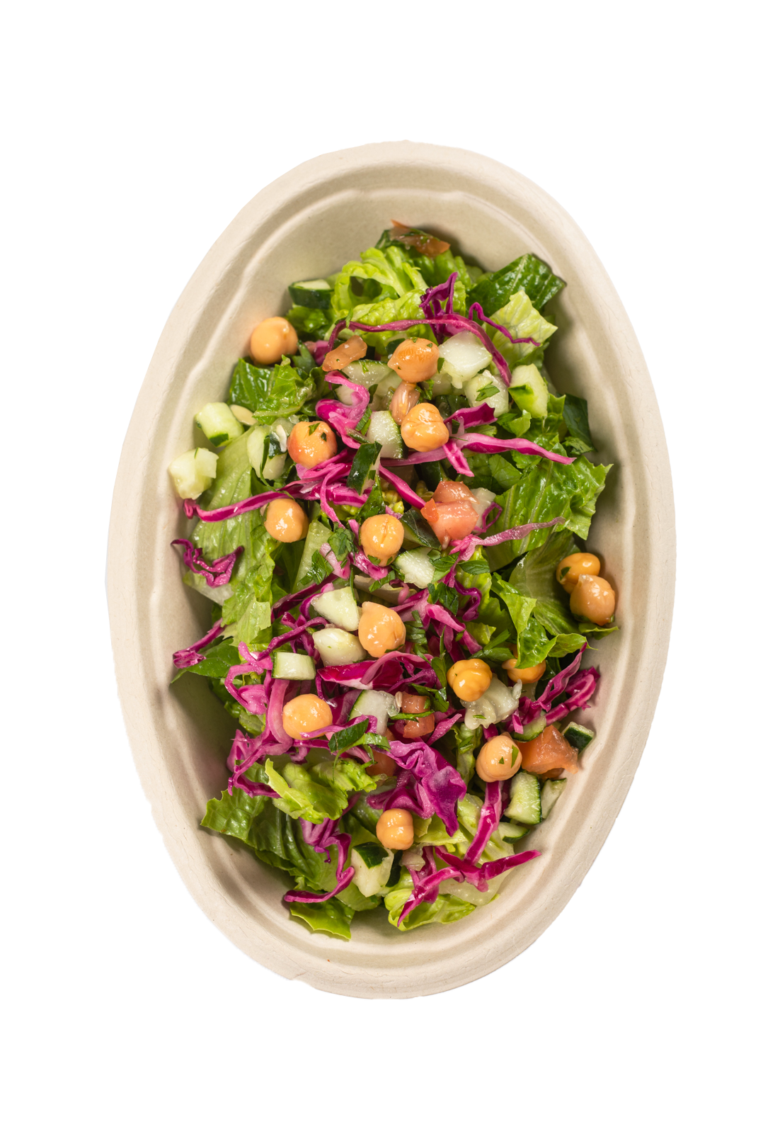 A combination of falafel and shawarma topped with creamy garlic, hummus, pickles, lettuce and tahini sauce.
